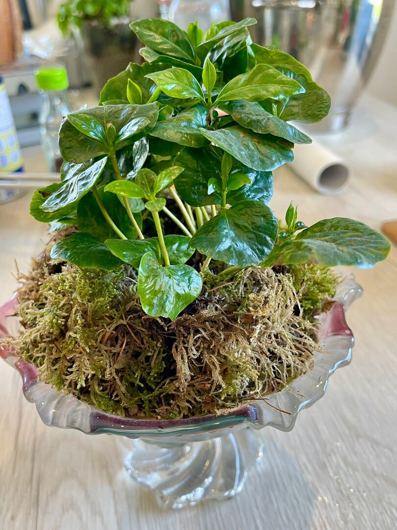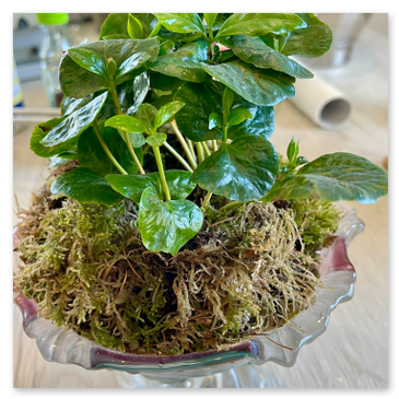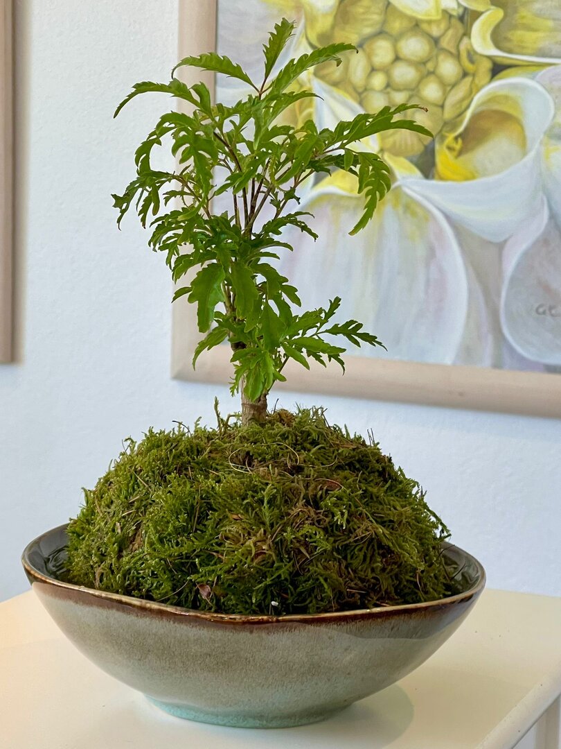 Die Pflanze wird wurzelschonend von alter Erde befreit, das Substrat zu einer kompakten Kugel geformt und mit Moos ummantelt. Danach wird die Kugel kreuzweise mit feinen Spannungen umwickelt: fest genug für Halt, flexibel genug für das Wachstum. Abschließend wird die Form beruhigt und die Oberfläche befeuchtet.