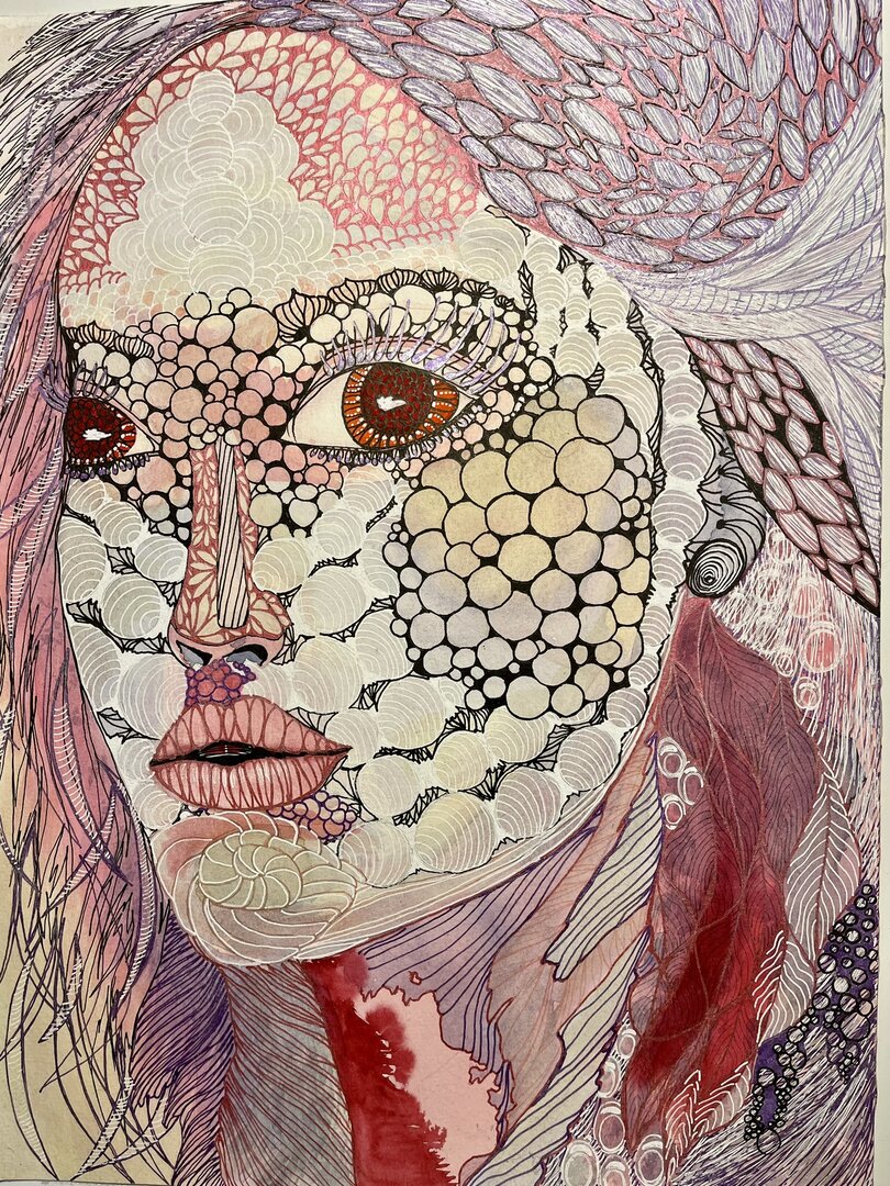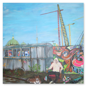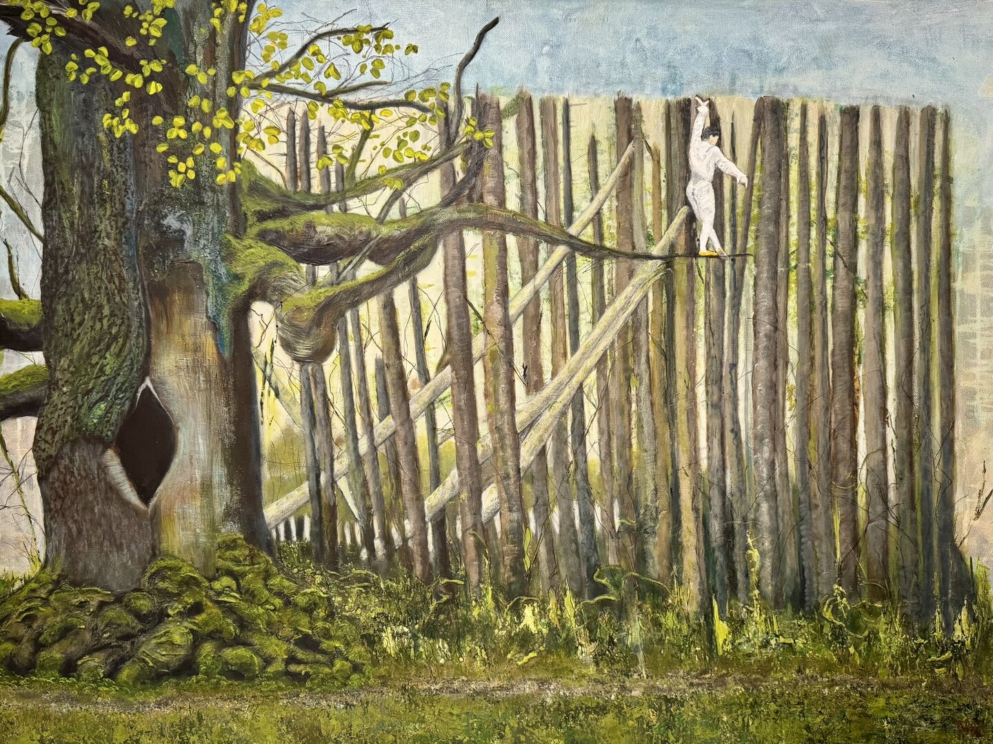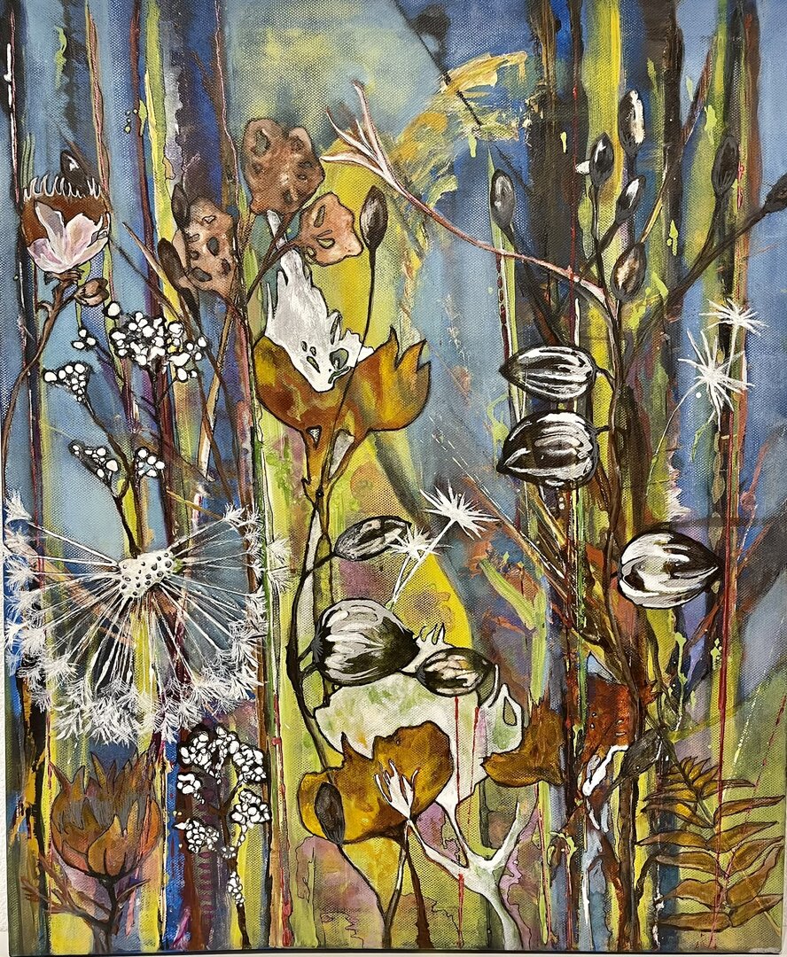 Materialien: Acryl auf Leinwand, Öl auf Holz, Aquarell auf feinem Baumwollpapier. Häufig kombiniert mit Graphit, Kreide, Tusche und Collageelementen.
