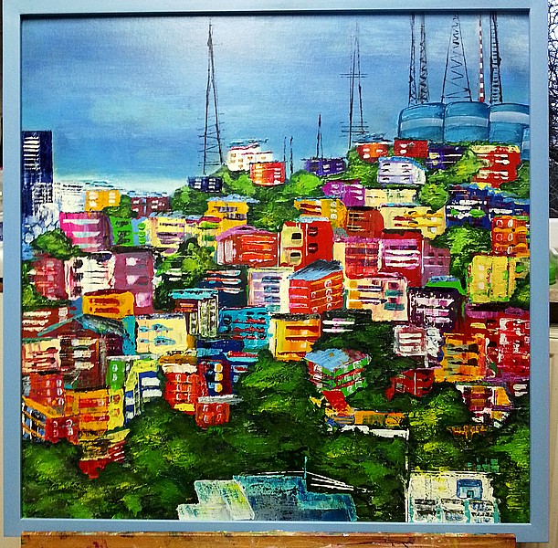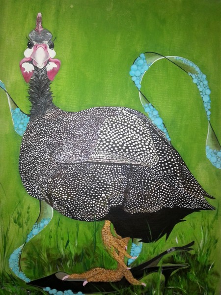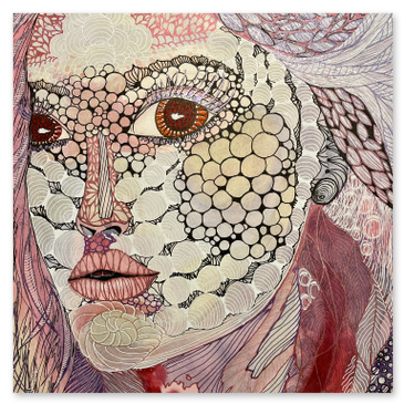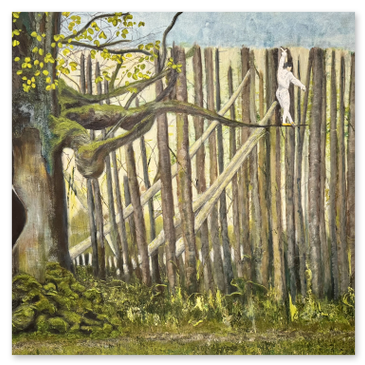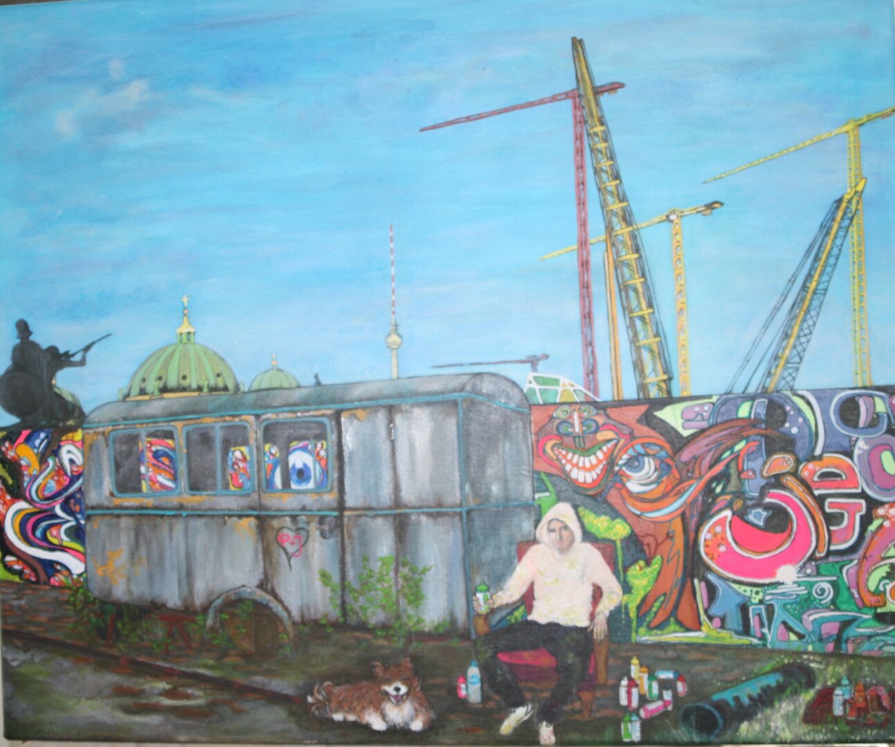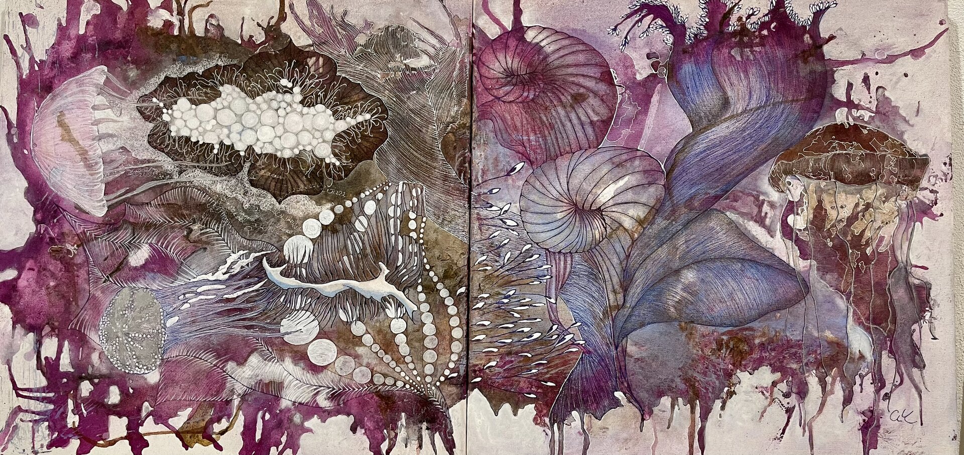 Materialien: Acryl auf Leinwand, Öl auf Holz, Aquarell auf feinem Baumwollpapier. Häufig kombiniert mit Graphit, Kreide, Tusche und Collageelementen.