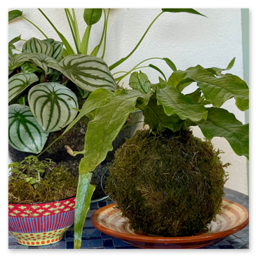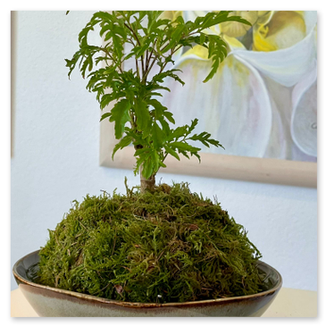 Die Pflanze wird wurzelschonend von alter Erde befreit, das Substrat zu einer kompakten Kugel geformt und mit Moos ummantelt. Danach wird die Kugel kreuzweise mit feinen Spannungen umwickelt: fest genug für Halt, flexibel genug für das Wachstum. Abschließend wird die Form beruhigt und die Oberfläche befeuchtet.